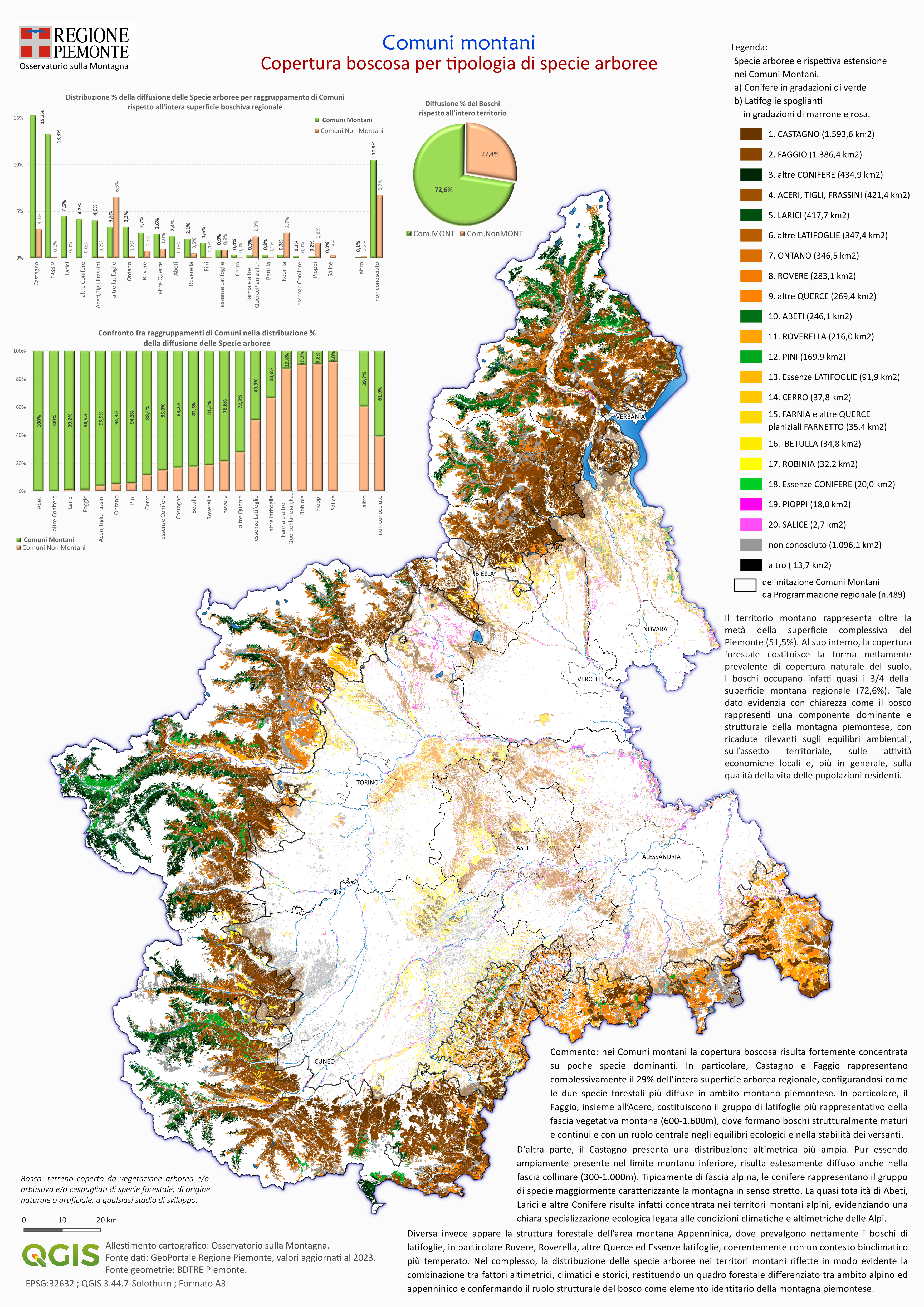 I territori montani rappresentano una componente strutturale del Piemonte, estendendosi su oltre la metà della superficie regionale (51,5%). In questo contesto, il bosco costituisce la forma di copertura del suolo nettamente prevalente, occupando circa il 72,6% della superficie montana e configurandosi come uno degli elementi identitari più rilevanti della montagna piemontese.