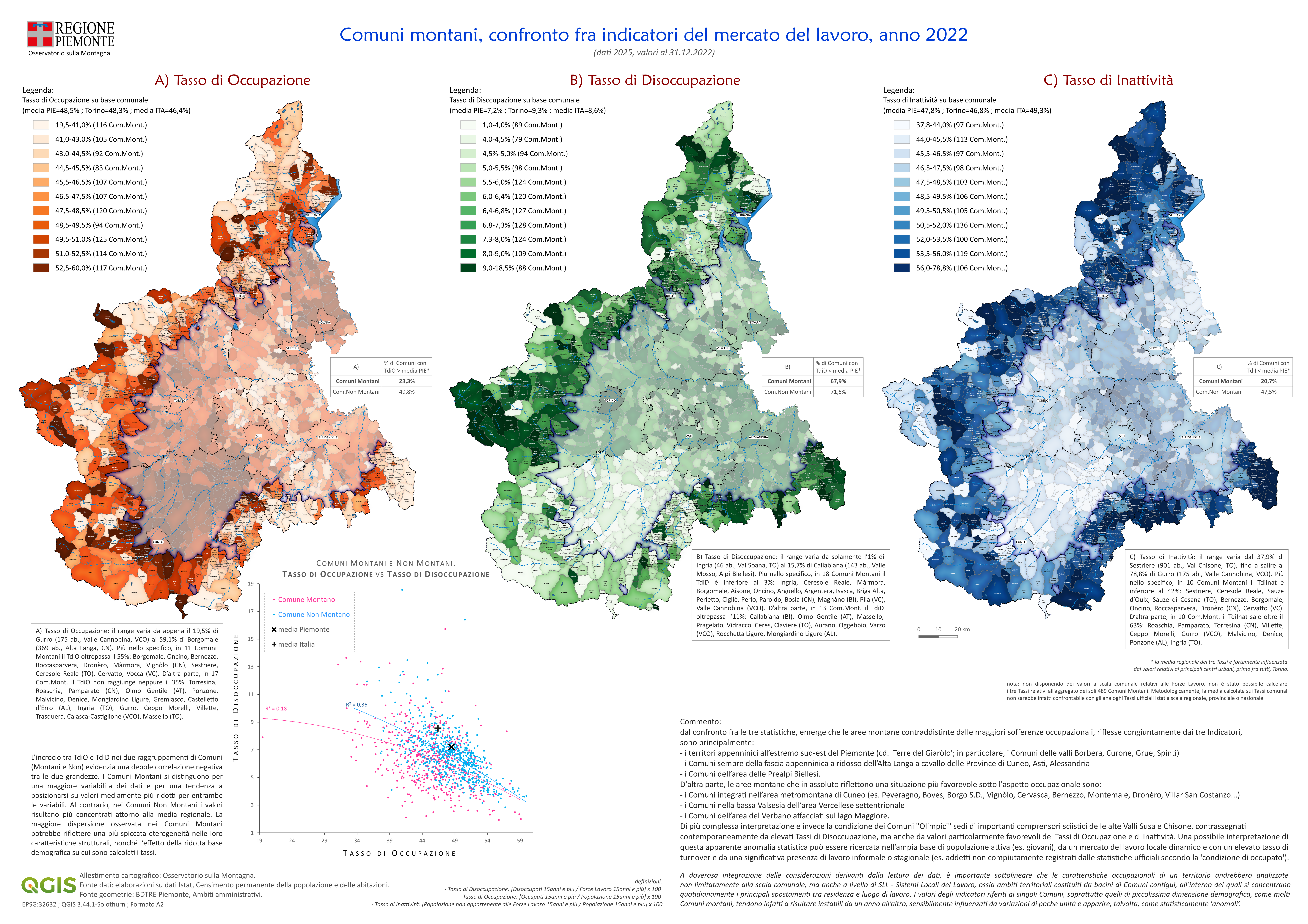 Gli indicatori più recenti sul mercato del lavoro (dati Istat 2025 su valori fine 2022) evidenziano una marcata disomogeneità tra i Comuni piemontesi. All'interno delle aree montane emergono differenze ancora più rilevanti. Accanto a Comuni capaci di esprimere una buona tenuta occupazionale, altri mostrano segnali di maggiore fragilità. Il divario risulta altrettanto netto nel confronto con i territori non montani, generalmente caratterizzati da un'offerta lavorativa più ampia e diversificata. Queste disparità riflettono fattori strutturali quali la composizione dei settori economici locali, il grado di specializzazione produttiva, la qualificazione delle forze lavoro, come anche la dotazione infrastrutturale territoriale.